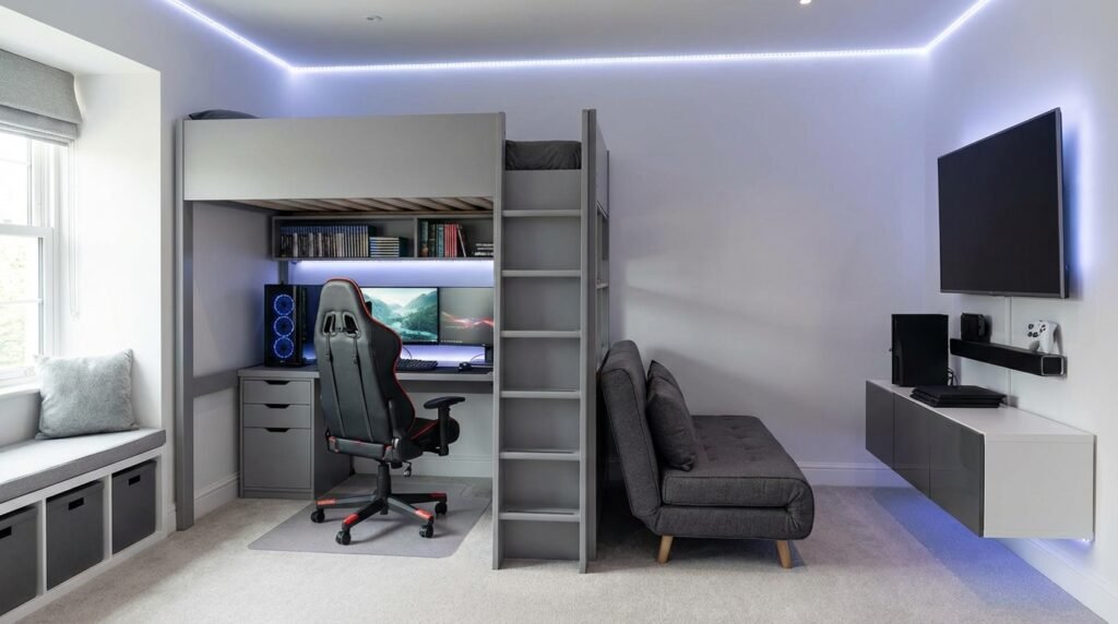 A loft bed gaming setup is still one of the most efficient answers for a room that has to hold both sleep and gaming. Bed goes up. Desk goes under. Basic geometry does the heavy lifting, not magic.